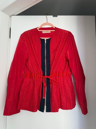 Chaqueta de la marca Purificación García en color rojo. - Diseño con detalles de encaje. - Cremallera central. - Cintura ajustable con cordón. Talla L pero talle como una M/L. Perfecto estado!