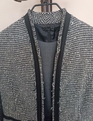 Elegante conjunto de dos piezas de la marca Purificación García. - Chaqueta con cierre de botones. - Falda con detalle de cintas. - Puesto en una boda. - Me costó 300 euros en el Corte Inglés.