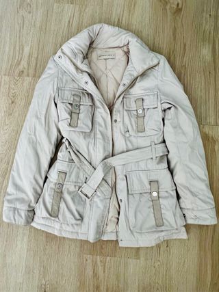 Conjunto de dos chaquetas tipo chubasquero. - Una chaqueta es de color blanco de zara talla m, y la otra de color beige, verde oliva, de PG, talla L - Ambas chaquetas tienen bolsillos frontales con solapa y cierre de botón.