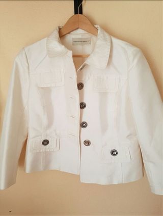 Preciosa chaqueta en blanco roto, talla 44 (dá poca talla, medidas en las fotos), ponible en cualquier momento. Divina para un evento especial e ideal como complemento para unos vaqueros. Sin duda esa prenda que no puede faltar en un fondo de armário. Más cosas en mí perfil :)