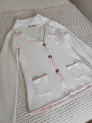 Preciosa chaqueta de punto de la marca Purificacion Garcia. Es de color blanco y talla S (equivalente a 36 u 8). Tiene un diseño elegante con detalles en rosa claro. - Tejido de punto suave. - Cierre de botones dorados. - Bolsillos funcionales. - Forro interior cómodo.