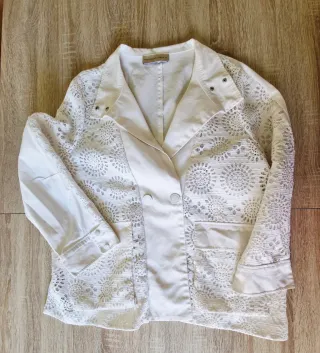 Elegante chaqueta con un diseño de encaje en blanco y negro. Perfecta para añadir un toque sofisticado a cualquier atuendo. - Diseño de encaje floral. - Cierre con botones. - Dos bolsillos delanteros. - talla poco, es una 40 pero realmente talla como una 36-38
