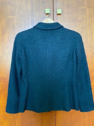 Chaqueta negra de Purificación García. Es una T/ 40 real (no como indica la etiqueta T/42). Composición 54% lana virgen y 32% mohair. Cierra con cuatro botones y tiene dos bolsillo sobrepuestos. Medidas: de hombro a hombro 42 cms, de sisa a sisa 48 cms, manga medida desde el hombro 58 cms, cintura 44 cms y largo total medido desde atrás 62 cms. Hago envíos. Es color negro, si bien en las fotos parece azulada es por la luz.