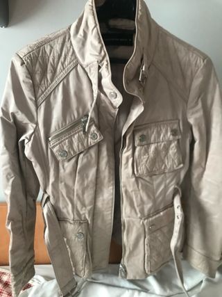 Chaqueta estilo sahariana de la firma Purificación García. Diseño elegante y funcional, ideal para entretiempo o diario. Detalles: • Marca: Purificación García (PG). • Talla: M. • Color: Arena / Beige claro. • Diseño: Cuatro bolsillos frontales con solapa, cinturón ajustable para entallar y parche con el logo 'PG' en la parte posterior del cuello. • Cierre: Doble sistema con cremallera y botones a presión. • Interior: Forro acolchado ligero en forma de rombos, muy cómodo. Estado: Impecable, muy cuidada.