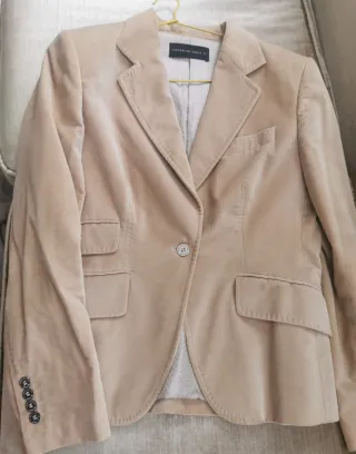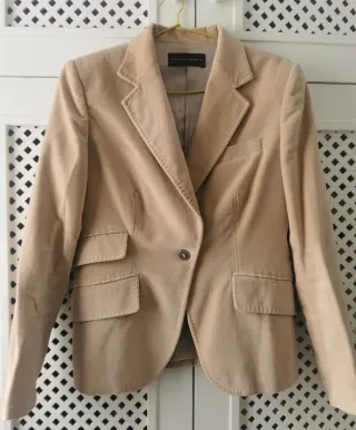 Elegante chaqueta de corte clásico en color beige de terciopelo. Pone 42 pero es mas una L que una XL. Abrigada y combinable - Diseño de solapa. - Cierre de un botón. - Dos bolsillos frontales. - Forro interior.