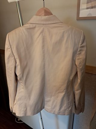 Elegante chaqueta de Purificación García, ideal para entretiempo. Es de color beige y talla 38. - Diseño clásico y atemporal. - Tejido suave y de buena calidad. - Perfecta para cualquier ocasión.