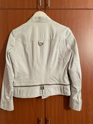 Chaqueta algodon para verano, color gris muy claro. La parte de abajo se puede hacer mas corta por la cremallera. Es una talla 40 pero es pequeña, casi podría ser una 38