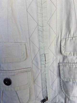 Chaqueta cazadora verde grisácea, con capucha desmontable, talla M. Purificacion García. Tiene un defecto en la capucha, una quemadura( hay una foto)
