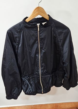 Chaqueta negra de Purificación García con un diseño moderno y detalles únicos. - Cuello con volante. - Mangas abullonadas. - Cintura ajustable con cordón. - Cierre de cremallera frontal.
