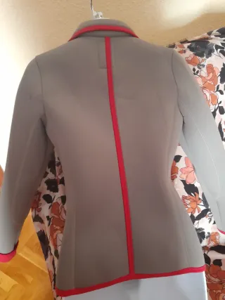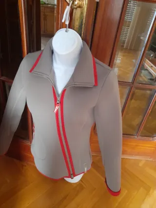 Chaqueta deportiva para mujer con un diseño moderno y detalles en contraste. - Color principal gris topo. - Ribete y cremallera frontal en color rojo vivo. - Cremallera asimétrica. - Puños y bajo con detalle en rojo. - Bolsillos laterales.