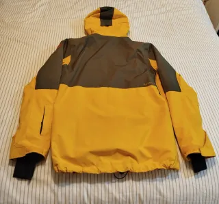 Chaqueta de esquí o snowboard de la marca Quiksilver. - Diseño con rayas azules y amarillas. - Interior forrado en color amarillo brillante. - Bolsillos interiores de malla y cremallera. - Cierre frontal con cremallera y solapa. - Capucha ajustable.