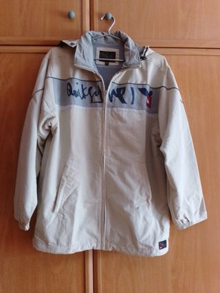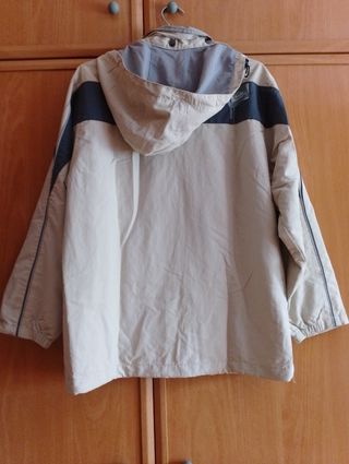 Chaqueta impermeable con capucha de puede quitar dos bolsillos exteriores y otro interior color beige combinado con gris y blanco se puede ajustar parte inferior roto un clip