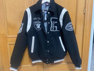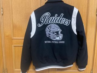 Disponible en tallas S / M. Chaqueta estilo varsity de los Raiders. - Mangas blancas. - Cuerpo negro. - Logo de los Raiders en el pecho. - Parche de la NFL en la manga.