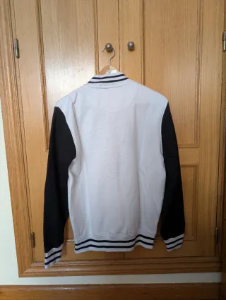 Espectacular chaqueta estilo varsity de la colaboración oficial Bershka x NFL. Diseño tricolor (negro, gris y blanco) con detalles bordados de alta calidad. Detalles del artículo: Estado: Muy bueno, bien cuidada. Diseño: Parche de casco de los Raiders en el pecho, logo NFL en la manga derecha y escudo Raiders en la izquierda. Nombre del equipo bordado en grande en la espalda. Cierre: Botones de presión (snaps) frontales. Corte: Oversize/Bomber, muy cómoda y abrigada. Talla: M (puedes ver las medidas exactas en las fotos).