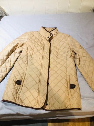 Chaqueta acolchada con ribetes marrones. - Cuello alto. - Cierre de botones. - Bolsillos frontales.