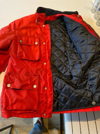 Chaqueta de la marca Belstaff en color rojo. - Diseño con múltiples bolsillos frontales. - Cierre de cremallera y botones a presión. - Cuello alto con ajuste. - Detalle de hebillas en el cuello. - Protectores para moto (codos y hombros) incluidos
