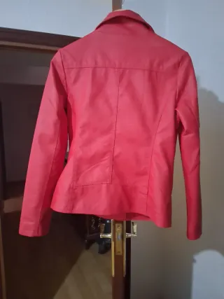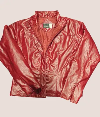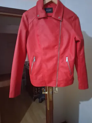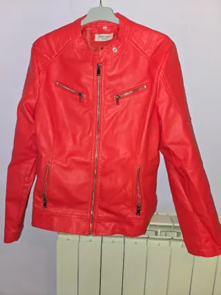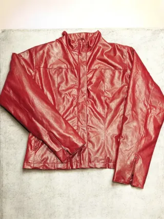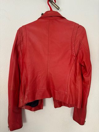 Chaqueta de cuero estilo motero en color rojo. - Diseño con cremalleras. - Cuello solapa. - Cierre frontal con cremallera.