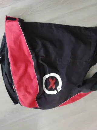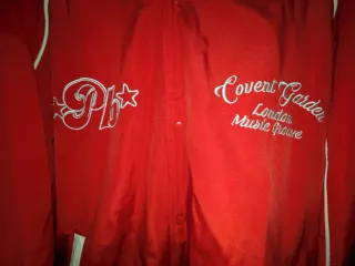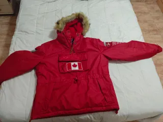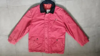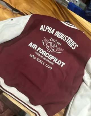 Chaqueta estilo universitario de Alpha Industries. 65cm de axila a axila 74 cm de largo. Es gruesa abriga - Mangas de color blanco. - Cuerpo principal de color rojo. - Puños y cuello a rayas.