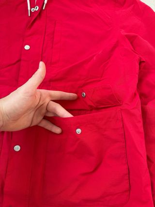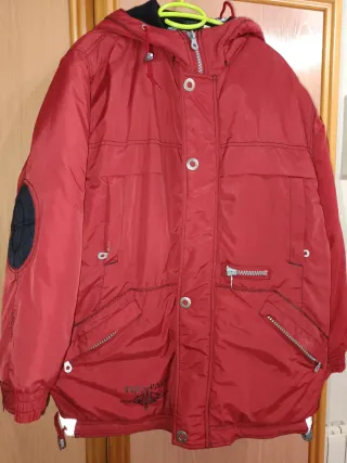 Chaqueta de invierno de color rojo, ideal para mantenerte abrigado. - Capucha integrada. - Cierre de cremallera y botones. - Bolsillos frontales con cremallera. - Detalle de parche en la manga. - Puños elásticos.