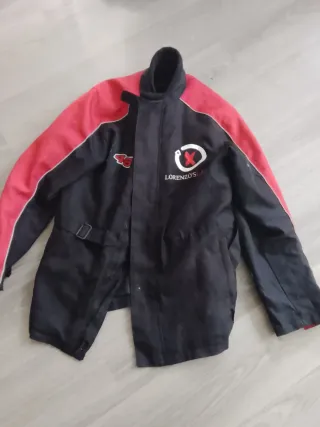 Chaqueta con diseño deportivo en color negro y rojo. - Mangas de color rojo. - Detalle de logo Lorenzo's en el pecho. - Cierre frontal con cremallera y solapa. - Cinturón ajustable en la cintura.