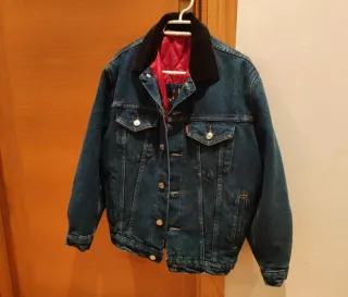 Chaqueta vaquera clásica de Levi's con un toque de color. - Diseño atemporal en azul. - Interior forrado en rojo vibrante. - Cuello de pana negro.