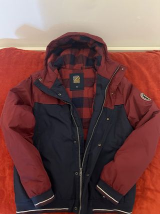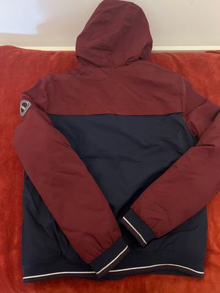 Chaqueta tipo anorak de la marca IKKS. - Diseño bicolor en azul marino y granate. - Capucha integrada. - Puños y bajo elásticos con detalles de rayas.