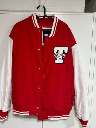 Chaqueta estilo varsity con mangas blancas y cuerpo rojo. - Cierre de botones a presión. - Cuello y puños con detalles de rayas. - Parche con la 'T' y el logo de Tommy en el pecho.