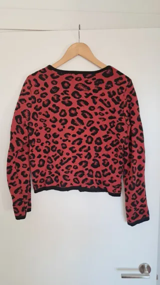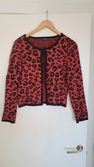 Chaqueta corta de punto con estampado de leopardo. Poco usada, en muy buen estado. No tiene cierre, solo un enganche en la parte de arriba. Talla 38 de Primark