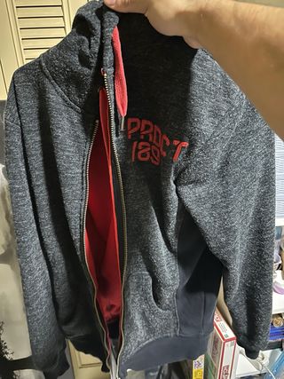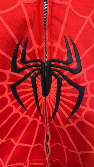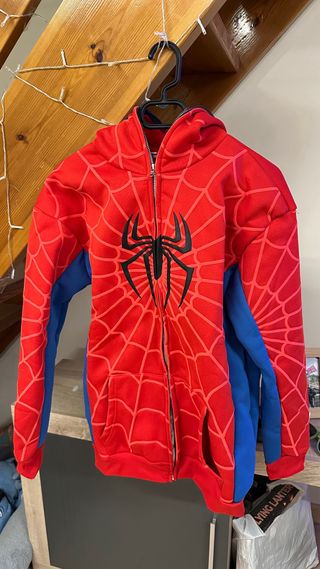 Chaqueta con diseño de Spiderman. talla S grande, equivale a una M - Diseño de telaraña en rojo. - Mangas de color azul. - Cierre de cremallera total, queda la capucha como una máscara de Spiderman