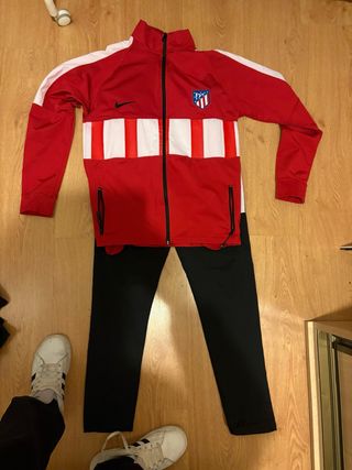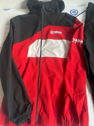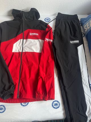 Conjunto deportivo Yamaha Racing con chaqueta y pantalón. - Chaqueta con diseño en color rojo, blanco y negro. - Pantalón negro con detalles blancos. - Logos de Yamaha Racing visibles.