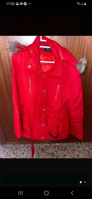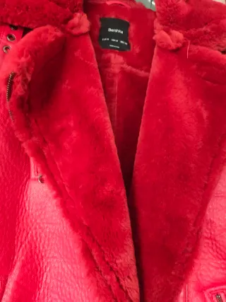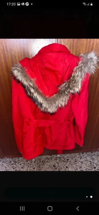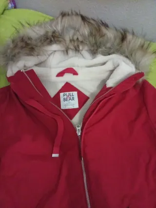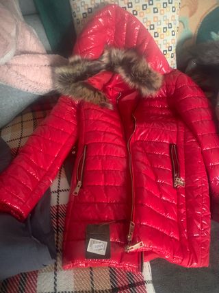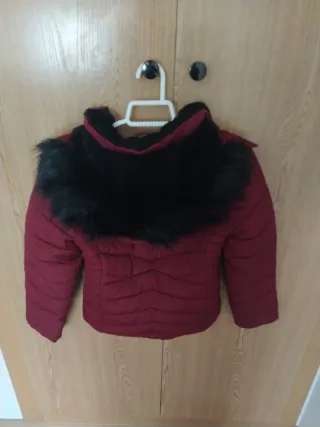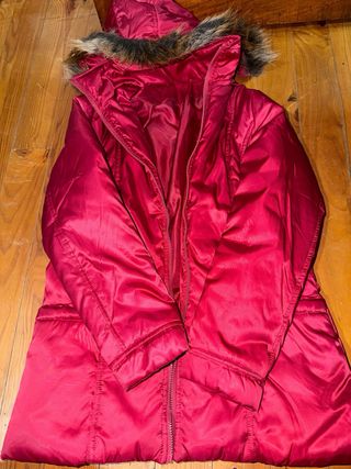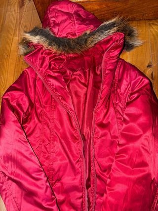 Chaqueta acolchada de color rojo brillante, con capucha y detalles de pelo sintético. - Cierre de cremallera frontal. - Bolsillos laterales con cremallera. - Puños elásticos.