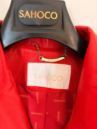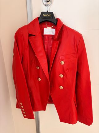 Chaqueta de cuero roja de la marca Sahoco. Diseño elegante con botones dorados. - Cuello solapa - Cierre cruzado - Puños con botones - Bolsillo de solapa en el pecho