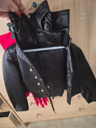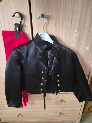 Traje de estilo castellonero con detalles en negro y rojo. Talla 4/6 años - Chaqueta corta con botones dorados. - Adornos de flecos rojos en la manga. - Lazos de ajuste en la cintura.