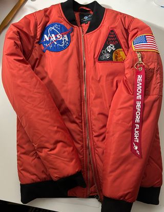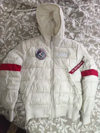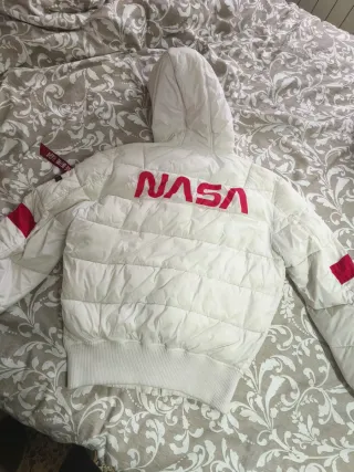 Chaqueta estilo bomber de Alpha Industries con temática espacial de la NASA. Diseño acolchado en color blanco con detalles en rojo. - Parche de la NASA en el pecho. - Parche conmemorativo de Apollo 14. - Tiras Remove Before Flight en la manga. - Puños y cintura elásticos. En perfectas condiciones Cremalleras en perfecto estado Envío fotos y medidas sin compromiso #alpha industries chaqueta anorak poncho navidad regalo