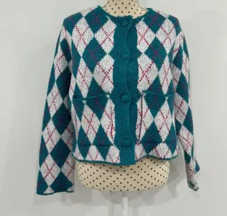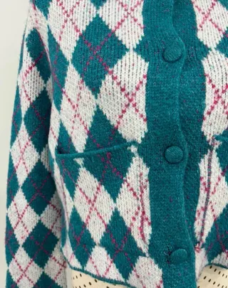 Chaqueta de punto con un diseño jacquard - Tejido cómodo y suave. - Estampado de rombos en tonos verdes ,rojos rosa y beige - Cierre de botones. - Bolsillos delanteros.