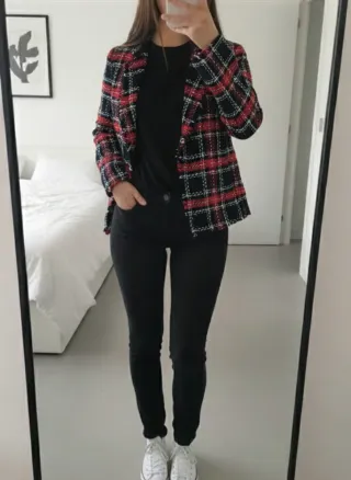 Elegante chaqueta de tweed de Zara Woman con un diseño a cuadros. - Diseño a cuadros en azul, rojo y blanco. - Acabado deshilachado en cuello, puños y bolsillos. - Cierre de un botón.
