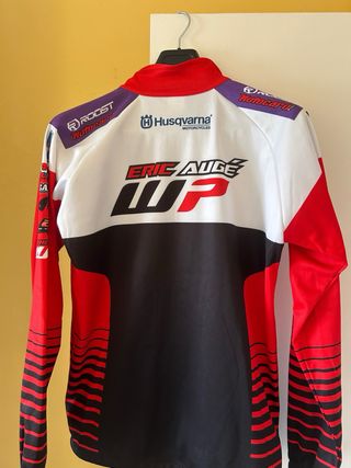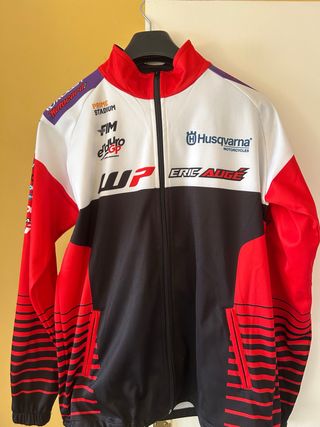 Chaqueta deportiva con diseño llamativo. - Mangas con detalles a rayas rojas y negras. - Cuello alto con cremallera. - Logos de Husqvarna y Eric Augé. - Bolsillos laterales.
