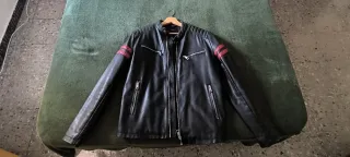 Chaqueta de cuero estilo motero con un diseño moderno y detalles llamativos. - Cuello alto. - Cierre de cremallera frontal. - Bolsillos con cremallera. - Ribetes blancos y rojos en hombros y mangas.