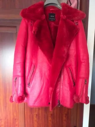 Chaqueta de mujer con un diseño moderno y detalles de pelo. - Color rojo vibrante. - Forro interior de pelo suave. - Cremalleras decorativas en los bolsillos.