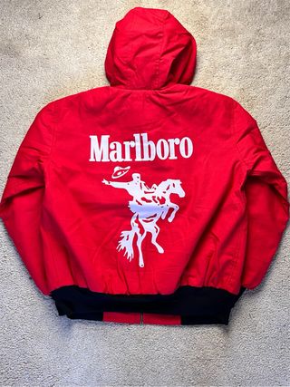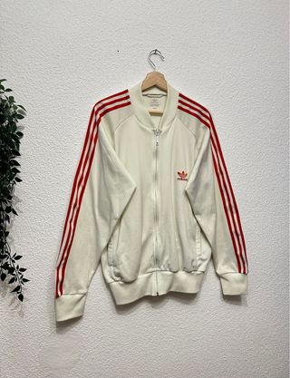 Chaqueta deportiva de la marca Supreme con un diseño llamativo. - Color blanco predominante con detalles en rojo y azul marino. - Logo de Supreme en la parte frontal. - Estampado repetido de la marca en la parte inferior.