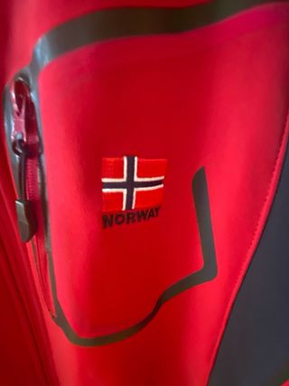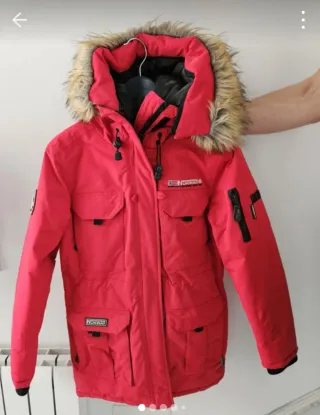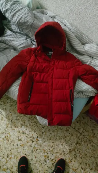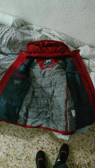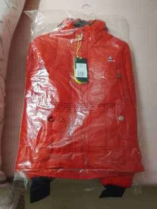 Chaqueta de invierno con diseño bicolor. - Mangas y paneles laterales en color negro. - Cuerpo principal en color rojo vibrante. - Capucha integrada. - Impermeable, no traspasa el agua - Se puede usar en nieve - Sólo un uso Es XL pero no talla muy grande