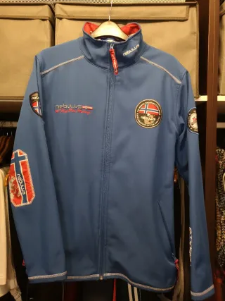 Chaqueta deportiva de la marca Nebulus con detalles en rojo. - Diseño con parches y bordados. - Cuello alto con cremallera. - Puños y bajo con ribete.