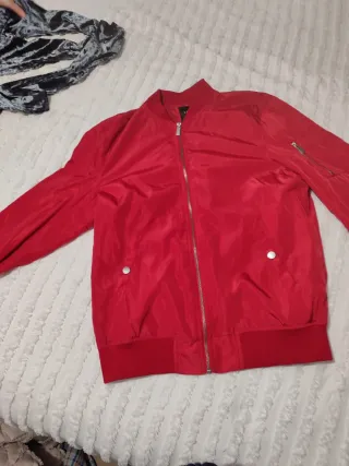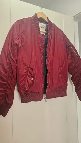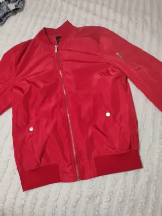 Chaqueta estilo bomber en color rojo. - Cierre de cremallera frontal. - Dos bolsillos laterales con botón. - Bolsillo con cremallera en la manga. - Puños y cintura elásticos.