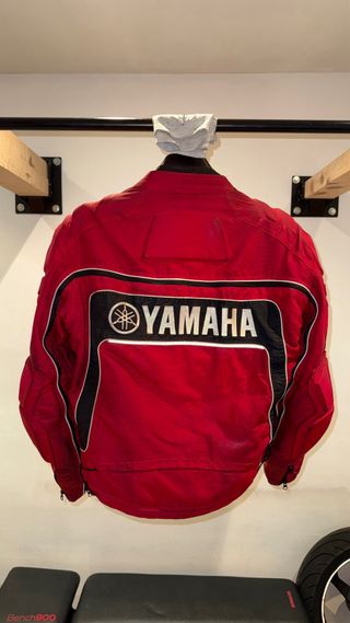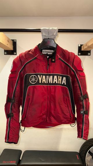 Chaqueta de motorista Yamaha en color rojo, negro y blanco, talla M con protecciones en hombros, codos y espalda. Estilo vintage, de los años 1990 - 2000. Está un poco sucia pero bien conservada. Tiene 2 forros internos, extraibles y una bolsa Yamaha de color gris con 2 asas. Honda, yamaha, suzuki, bmw, aprilia, ktm, husqvarna, gas gas, sherco..