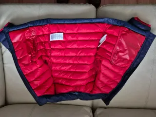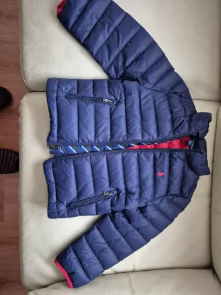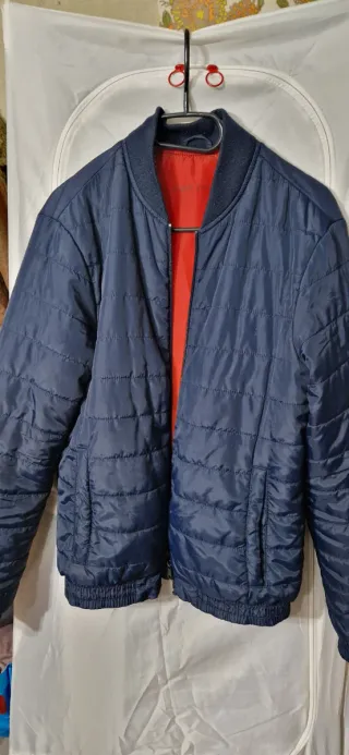 Chaqueta acolchada reversible con un diseño moderno y versátil. - Exterior azul marino. - Interior de color rojo vibrante. - Cuello y puños elásticos. - Cierre de cremallera frontal.