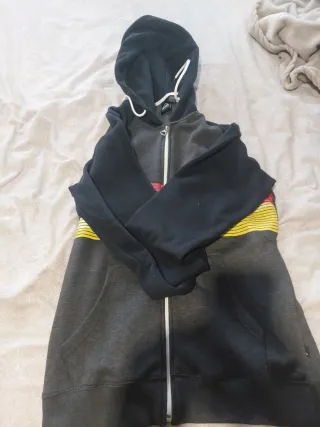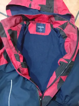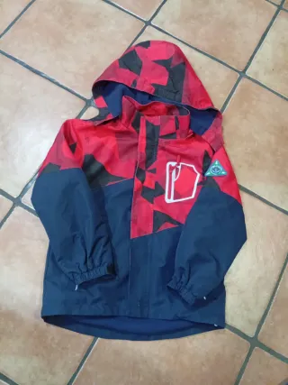 Chaqueta con capucha para niño. Talla 130cm. Comprado en Amazon. - Diseño con estampado geométrico en rojo y negro. - Mangas y parte inferior en azul marino. - Cierre de cremallera frontal. - Puños elásticos.