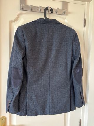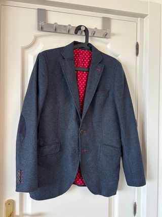 Elegante traje de chaqueta con un llamativo forro interior. - Chaqueta de color azul. - Forro interior de color rojo.