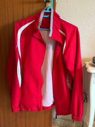 Chaqueta deportiva de color rojo con detalles en negro. - Cierre de cremallera frontal. - Bolsillo con cremallera en el pecho. - Dos bolsillos laterales con cremallera. - Cuello alto.