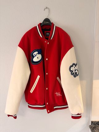 Chaqueta tipo bomber universitaria de Zara en excelente estado. Diseño clásico con cuerpo en color rojo y mangas en contraste tono hueso. • Talla: XL. • Detalles: Parche bordado en el pecho, cierre de botones a presión y acabados elásticos en cuello y puños. • Estado: Muy cuidado, sin marcas de uso reseñables. • Corte: Regular/Relajado. Prenda icónica de Zara, cómoda y perfecta para looks streetwear. Envío rápido y protegido. 📦 #Zara #Varsity #Bomber #Streetwear #ModaHombre #TallaXL #Chaqueta