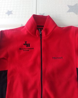 Chaqueta deportiva de polar con cremallera frontal. Presenta un diseño bicolor en rojo y negro, con detalles bordados. Está en buen estado y es ideal para actividades al aire libre. - Dos bolsillos laterales con cremallera. - Logo Marmot en el pecho derecho. - Logo de Jackson Hole en el pecho y la espalda. - Talla L. Largo - 68 cm, Ancho - 58 cm, Manga - 65 cm